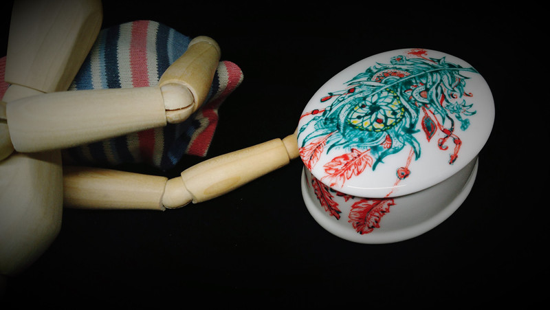 Aplica técnicas de tercer fuego en una cajita de porcelana decorada con motivos de atrapasueños. Incluye cocción en microondas.
